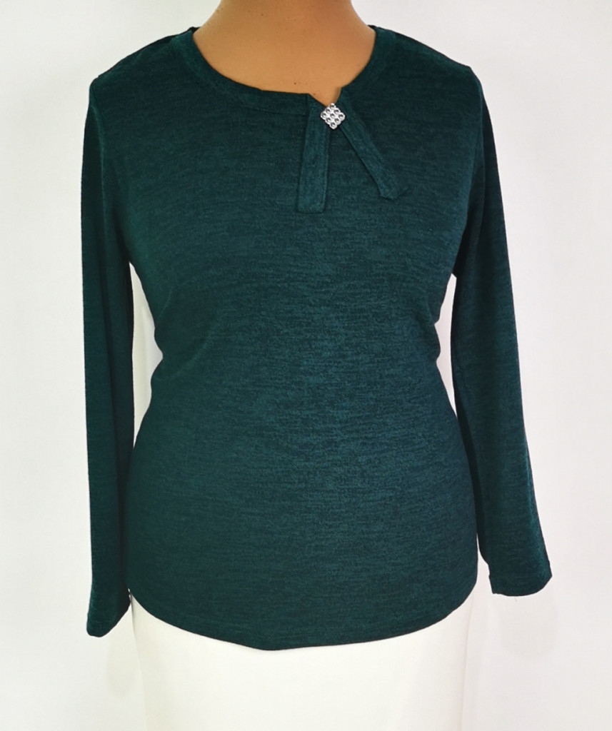 "V" nyakú, hosszú ujjú, sötétzöld színű, nyaknál díszített, pamutos anyagú,alkalmi felső. 3-4 cm-t enged.