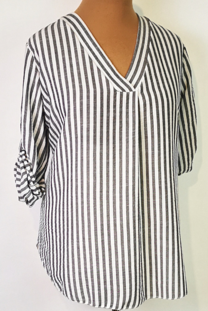 "V" nyakú, roll upos ujjú, aszimmetrikus, kerekített aljú, fehér-szürke csíkos mintás, pamutos anyagú felső. 3-4 cm-t enged.