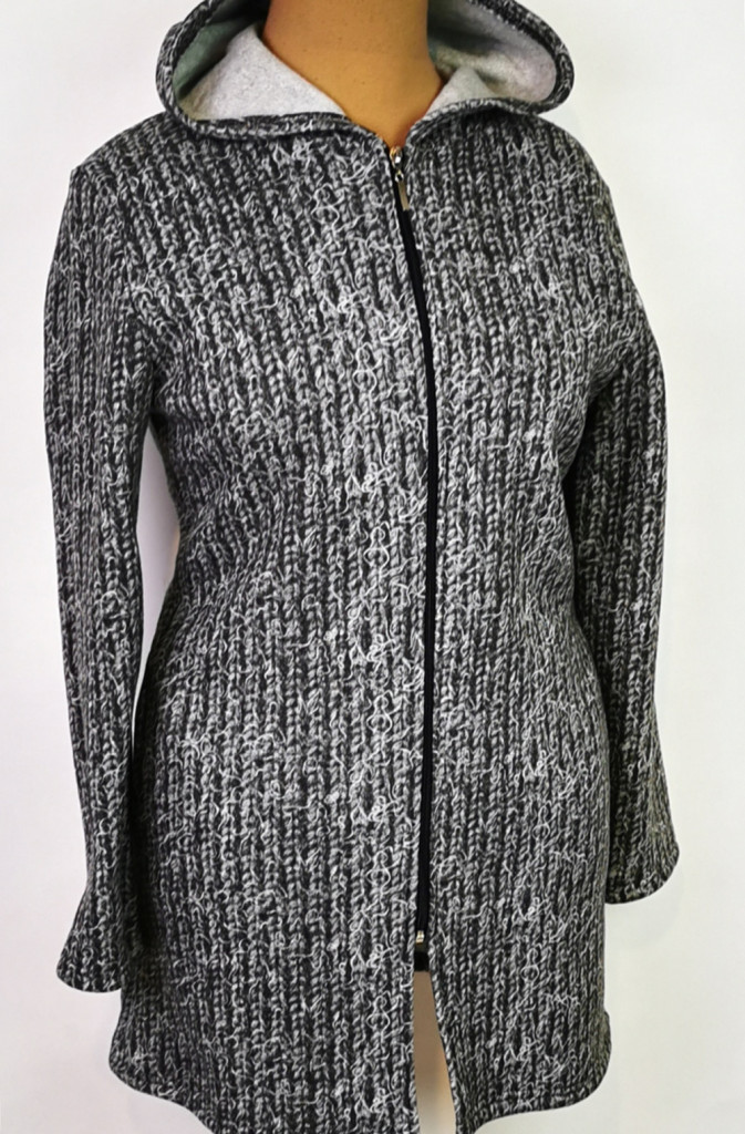 Világosszürke-sötétszürke mintás, zsebes, elől cipzáras, kapucnis, átmeneti polár dzseki. 2-3 cm-t enged.