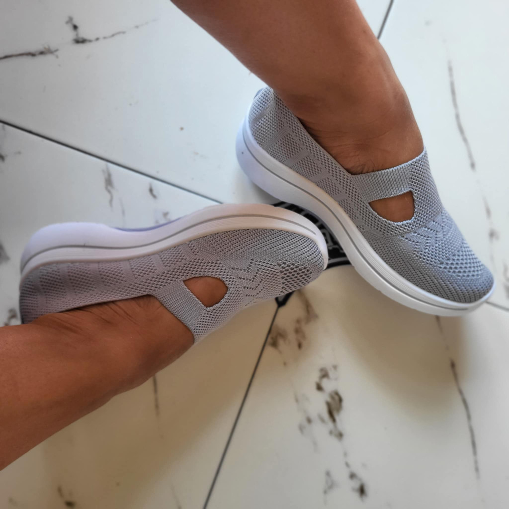 Világosszürke színű, lábfejnél nyitott, anyagában mintás, belebujós, könnyű, nyári, női sportcipő 36-41