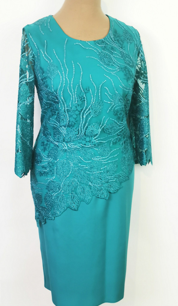 Kerek nyakú, 3/4-es ujjú, hátul cipzáras, felsliccelt, gyönyörű zöld színű, elől enyhén csillogó, ezüst színű, hímzett csipke rátéttel díszített alkalmi ruha. 2-3 cm-t enged.