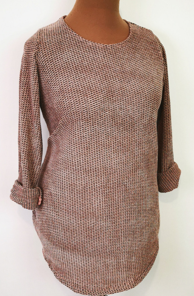 Kerek nyakú, puha, gépi kötött, hosszú ujjú, mályva-fekete színű, lefelé bővülő pulóver. 7-8 cm-t enged