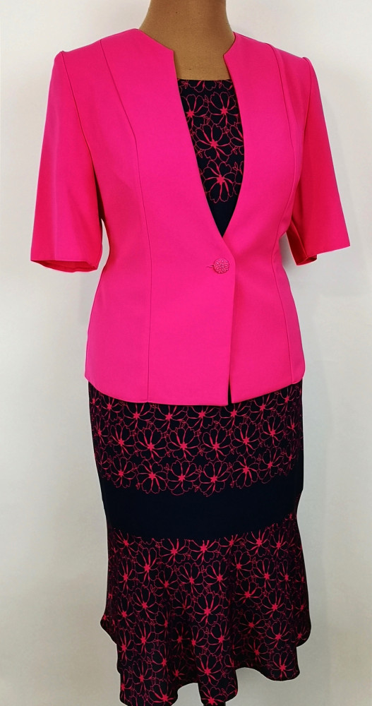 Gyönyörű három részes alkalmi kosztüm, szoknya része selyem béléses, kétoldalán gumis, térdtől lefelé bővülő, felső része kerek nyakú, rövid ujjú. A szoknya és felső sötétkék alapszínű, pink színű mintával díszítve. Blézere pink színű, csinos nyakú, rövid ujjú, egy díszgombos. 1-2 cm-t enged.