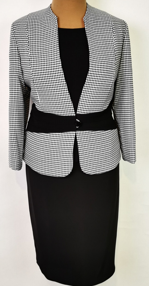 Gyönyörű három részes alkalmi kosztüm, szoknya része selyem béléses, fekete színű, hátul cipzáras, felsliccelt, kétoldalt gumibetétes. Felső része kerek nyakú, rövid ujjú. Blézere egy gombos, deréknál fekete betéttel díszített, fekete-fehér pepita mintás. 1-2 cm-t enged.