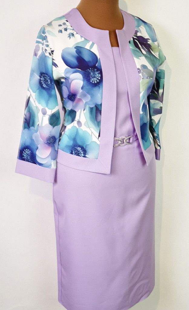 Kerek nyakú, 3/4-es ujjú, felsliccelt, világos lila színű, elől fehér alapon színes mintás, díszcsatos ruha. 1-2 cm-t enged.