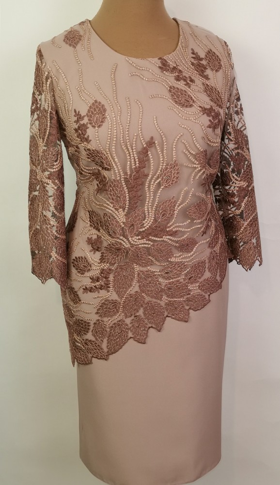Kerek nyakú, 3/4-es ujjú, hátul cipzáras, felsliccelt, tejeskávé barna színű, hárul egyszínű, elől hímzett csipke rátéttel díszített alkalmi ruha. 2-3 cm-t enged.
