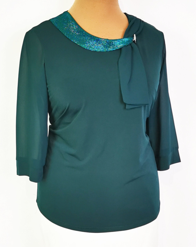 Kerek nyakú, 3/4-es ujjú, nyaknál díszített,sötétzöld színű, selymes rugalmas anyagú felső. 5-6 cm-t enged.