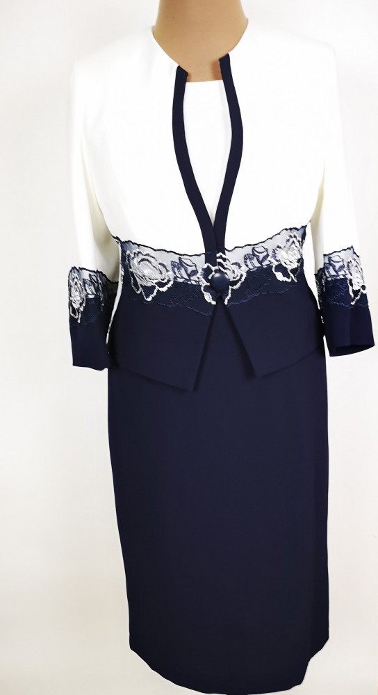 Gyönyörű, sötétkék-fehér színű, két részes alkalmi kosztüm, ruha része kerek nyakú, rövid ujjú, selyembéléses, hátul derékig cipzáras, felsliccelt, alsó része sötétkék, nagyon szép hímzéssel díszített. Blézere 3/4-es ujjú, selyembéléses, szegővel és hímzéssel díszített, egy díszgombos. 1-2 cm-t enged.