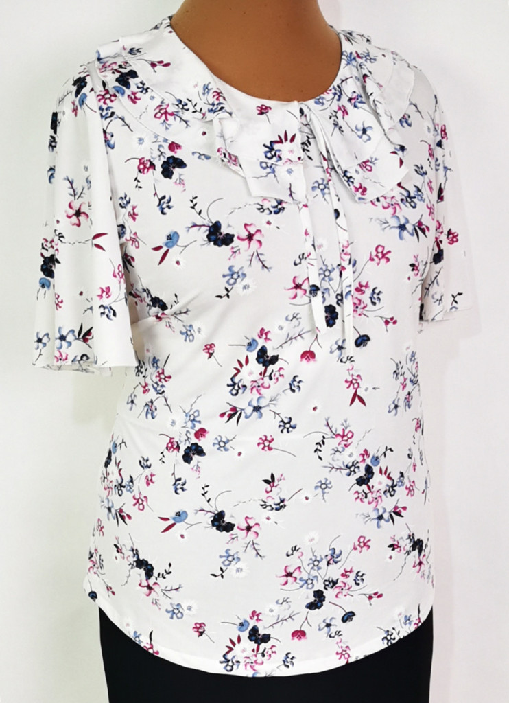 Színes mintás mintás, nyaknál muszlin fodorral díszített, selymes, rugalmas anyagú felső. 6-7 cm-t enged.