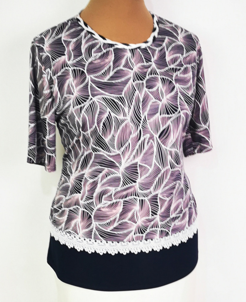Kerek nyakú, rövid ujjú, sötétkék alapon fehér-rózsaszín színű mintás, selymes anyagú felső. 2-3 cm-t enged.