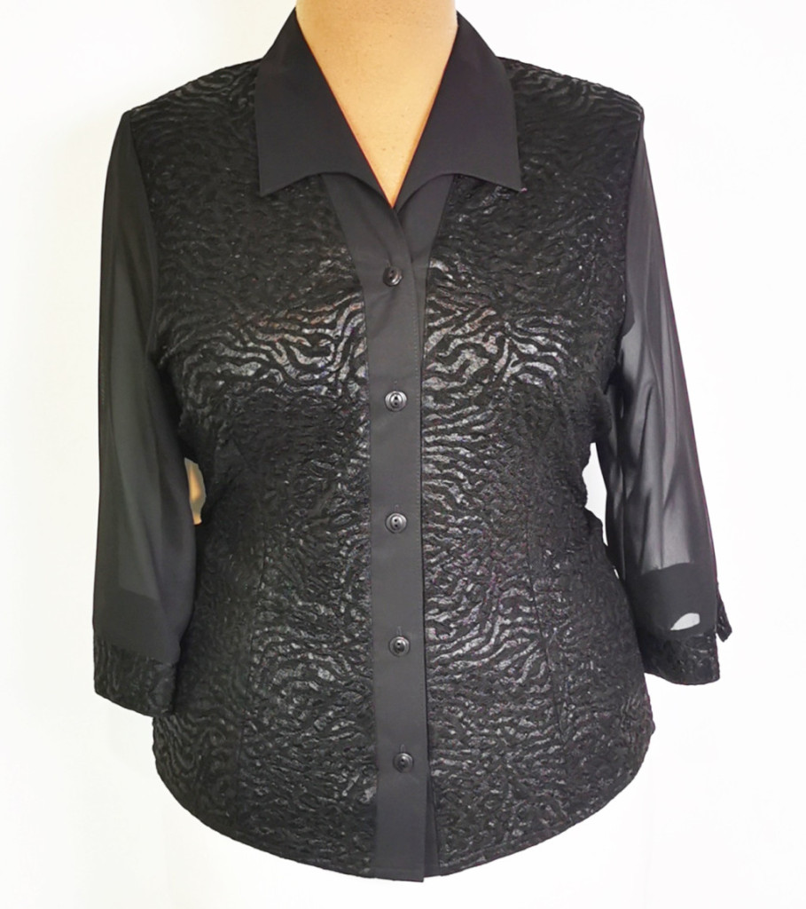 Ingnyakú, elől végig gombos, 3/4-es ujjú, fekete alapszínű, anyagában mintás, selymes anyagú alkalmi felső. 2-3 cm-t enged.